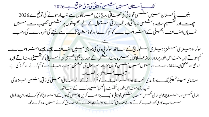 By 2026, solar energy is projected to be a key part of Pakistan’s energy landscape, offering a cleaner and more affordable power solution amid rising electricity prices and environmental concerns. Despite challenges like policy uncertainty and high upfront costs, strategic planning and supportive regulations can unlock its potential. Continued progress in solar energy is expected to enhance energy security, reduce reliance on imported fuels, and promote economic stability.